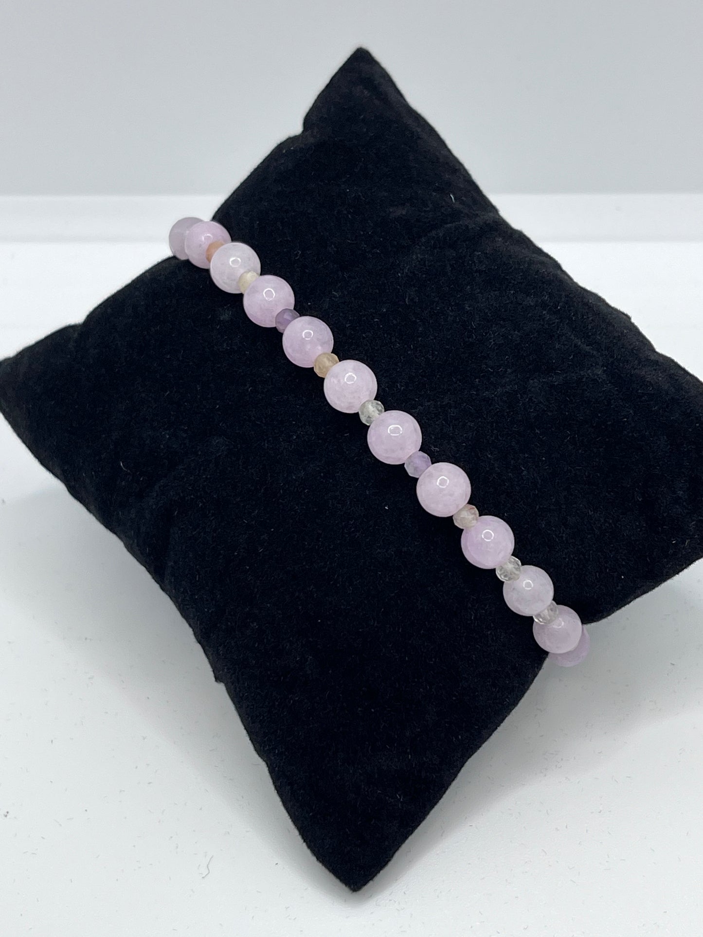 Armbånd med 6 mm Kunzit krystaller og 3 mm faceterede Jordbær Quartz krystaller