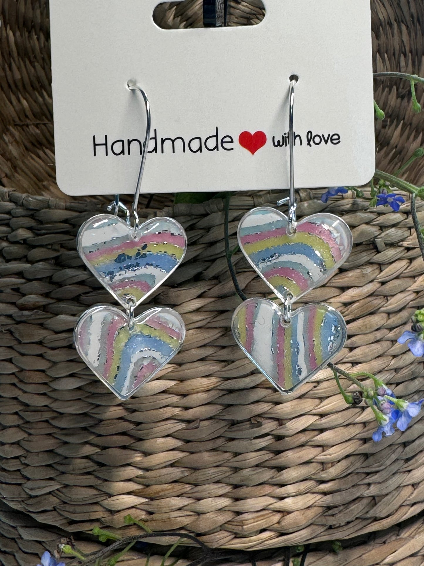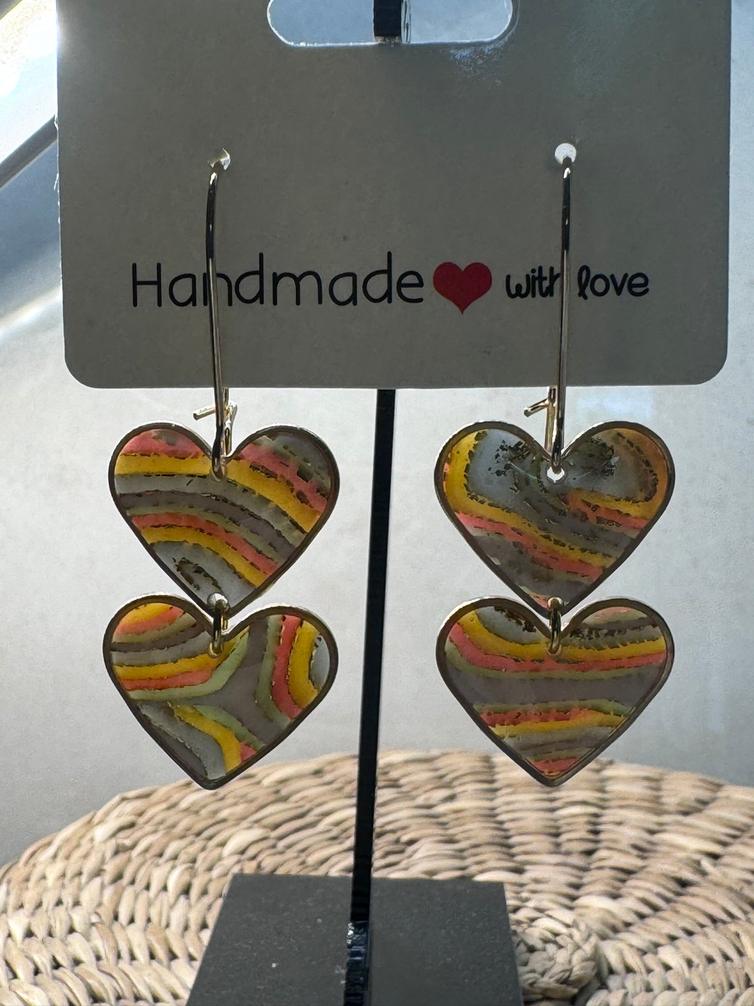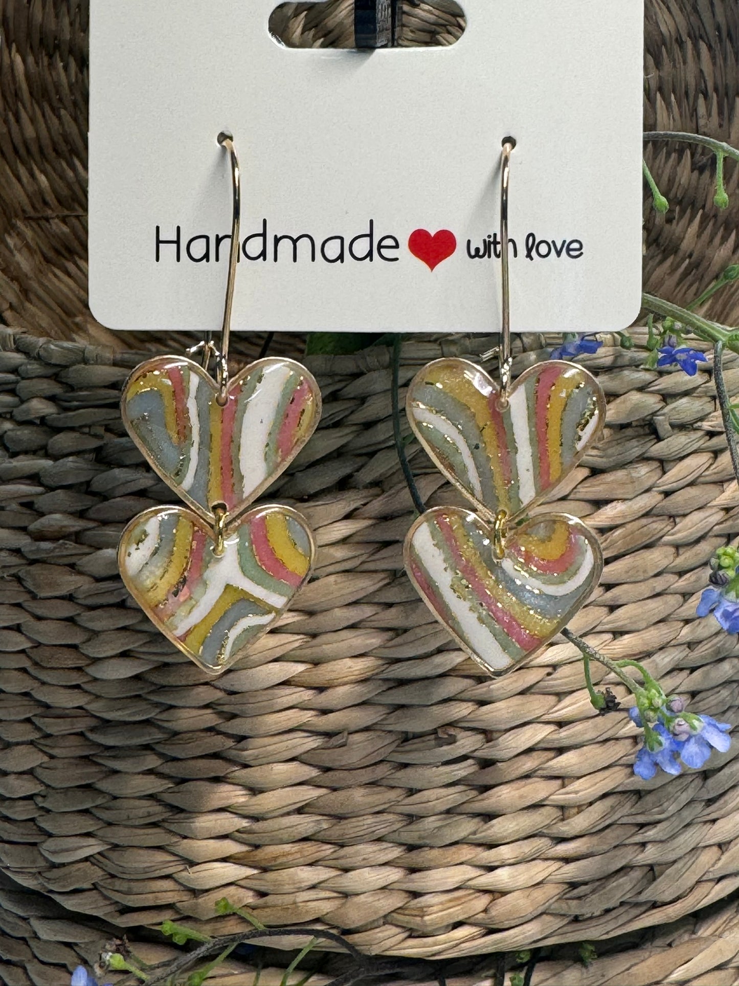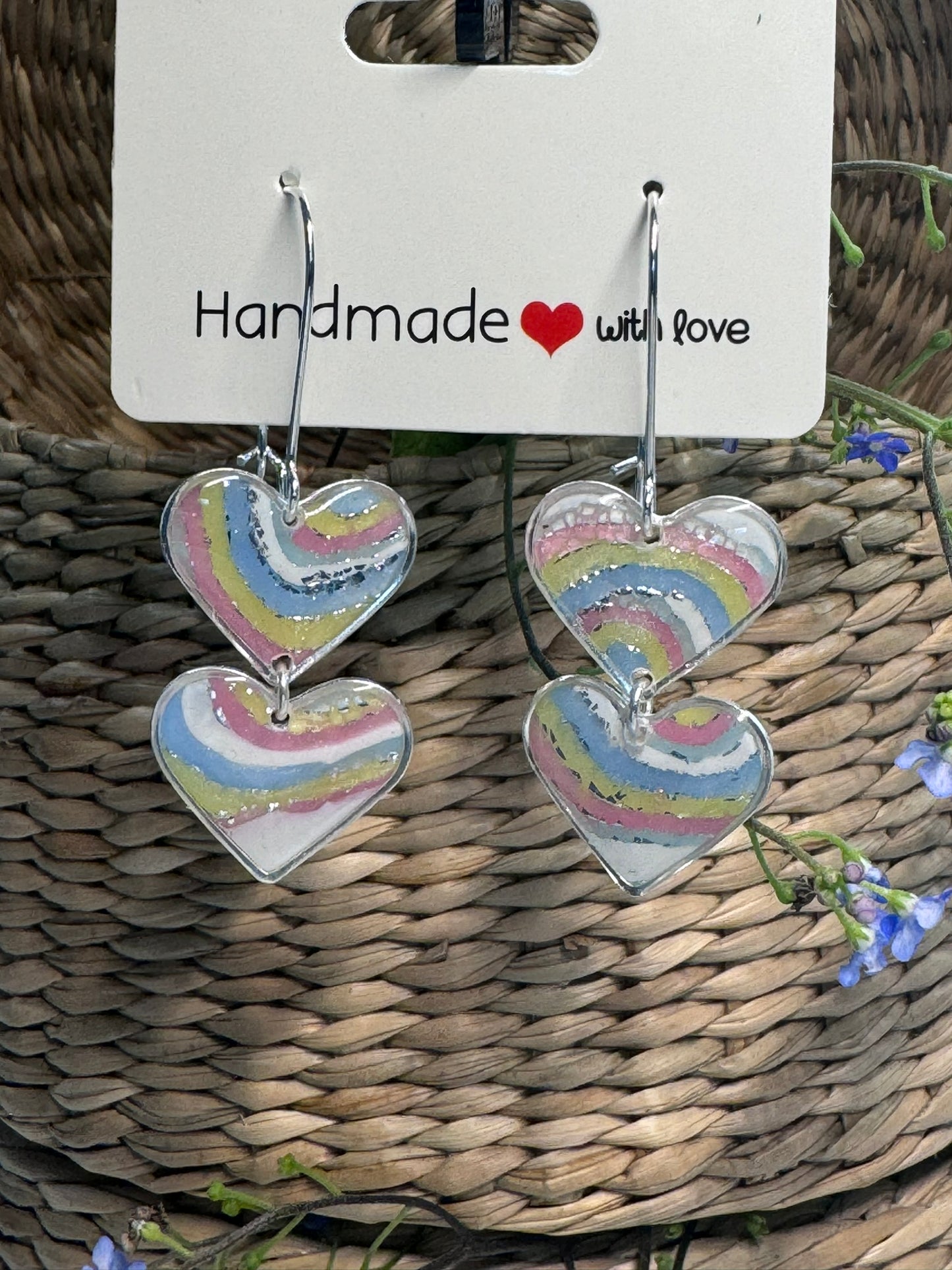I blå, gul, lyserød, grøn og hvidt mønster, med enten sølv eller guld effekt. Øreringene har også en marmoreffekt, når der kommer lys bagved, se billeder.