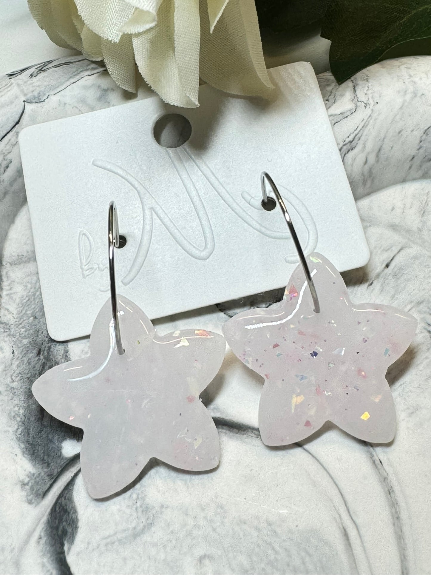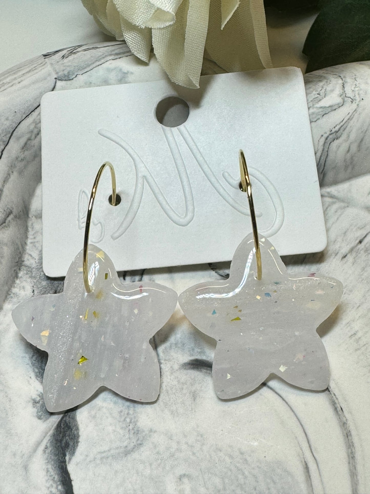 Stjerne formet øreringe i polymer belagt med resin. I grålige marmoreret nuancer med glimmer.