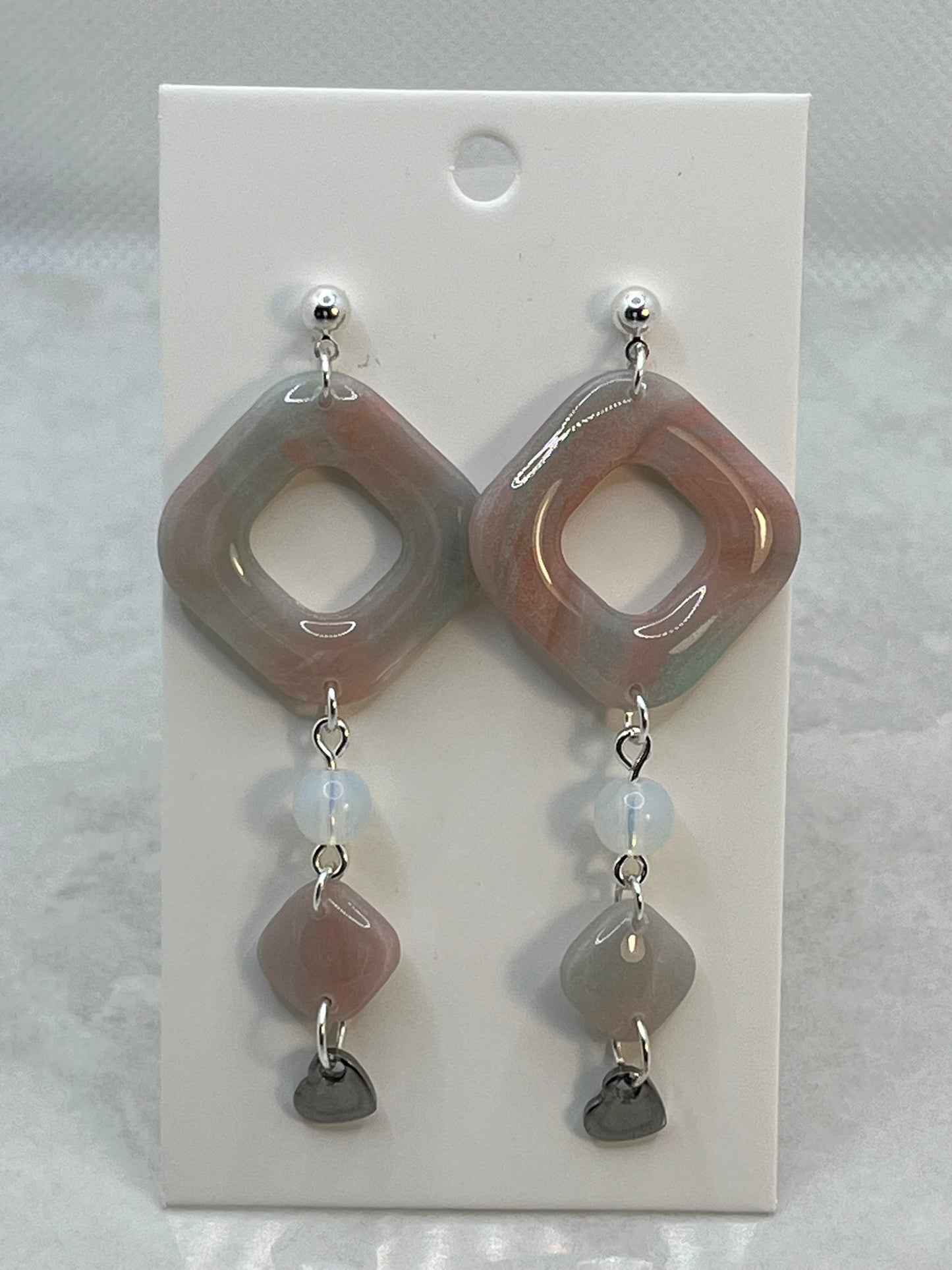 Øreringe i fimo med vedhæng. Grønne og orange nuancer, med marble effekt.