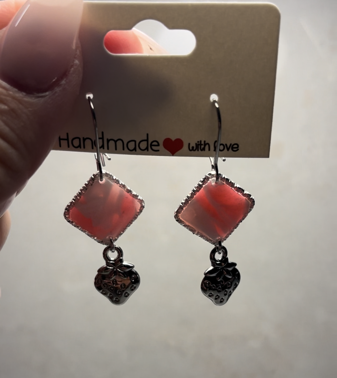 Kvadratiske øreringe i polymer belagt med resin. Struktur ramme og jordbær vedhæng